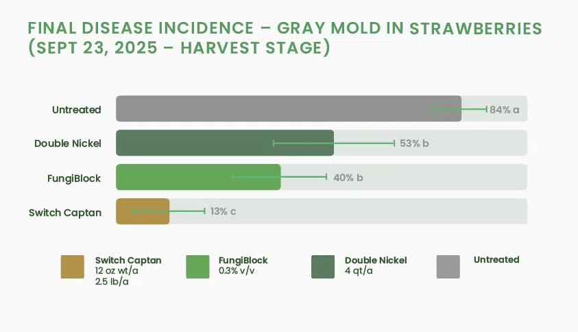 FungiBlock reduziu a incidência final de mofo cinzento em morangos de 84% no controle não tratado para 40% na colheita, sob pressão natural da doença. Também apresentou incidência numericamente menor da doença do que o comparador biológico, Double Nickel, neste estudo. Ao mesmo tempo, o método convencional Switch + Captan proporcionou o controle absoluto mais eficaz. Portanto, o posicionamento tecnicamente mais defensável é o seguinte: FungiBlock é uma opção botânica viável para o manejo preventivo do mofo cinzento em morangos, particularmente como um parceiro de rotação e ferramenta de flexibilidade no final da safra dentro de programas de MIP (Manejo Integrado de Pragas), e não como um substituto definitivo para o método convencional mais eficaz. Essa mensagem é precisa, comercialmente útil e respaldada pelos dados disponíveis.